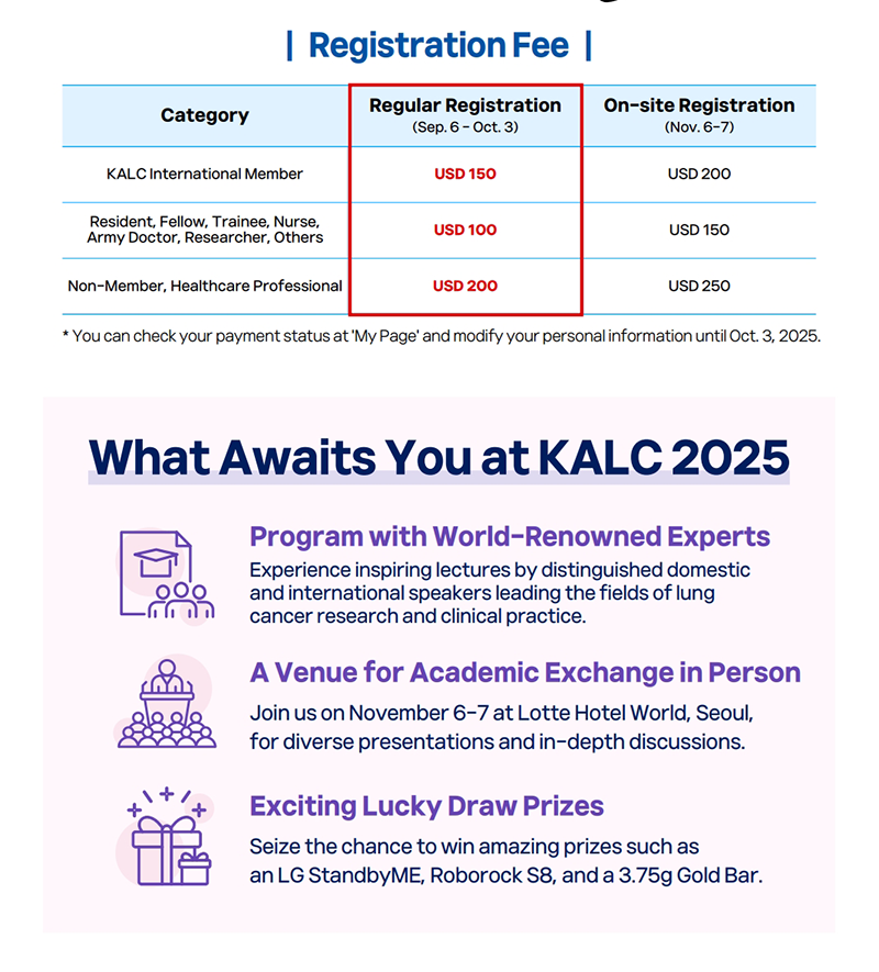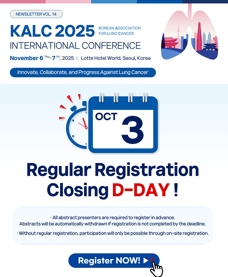 [KALC 2025 Vol. 14] 대한폐암학회 국제학술대회 사전등록 마감 D-DAY! 2025.10.03 |